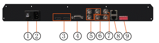 序號 名稱 功能 1 電源開關 控制電源 2 電源線插入插口 外接220VAC電源輸入 3 HDMI輸入 外接HDMI輸入信號,最高支持1920*1080@60Hz (分HDMI1與HDMI2兩個接口) 4 VGA輸入 外接VGA 15Pin接口信號輸入 5 Y/Pb/Pr輸入 外接Y/Pb/Pr BNC輸入 6 AV輸入 外接視頻BNC輸入(分AV1與AV2兩個接口) 7 AV1環出 當切換到AV1輸入時,該接口可以將AV1的視頻信號BNC輸出 8 RS232輸入輸出 RS232控制信號RJ45接口輸入輸出 9 撥碼開關 設置本設備的地址撥碼開關(僅限拼接使用)