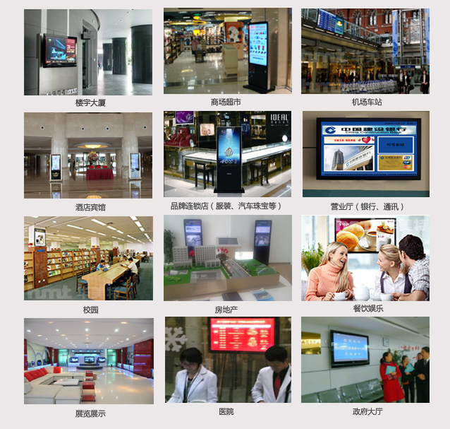 液晶廣告機應用領域: 彩晨科技(CYLSON)液晶廣告機,廣泛應用于商場、醫院、學校、銀行、酒店、商廈、機場等場所的廣告宣傳和信息發布。 1、金融證券----各個營業網點放置廣告機,可以發送各個網點的特色、信息(圖片、動畫)…… 2、交通運輸----機場、車站、碼頭等熱點地方放置廣告機,可以發送本地的旅游、住宿等信息; 3、地產物業----售樓中心、小區等放置廣告機,可以發送地產商的樓盤信息、促銷信息、銷售情況等; 4、賓館酒店----各個大堂或會議室等放置廣告機,可以發送本店的服務信息、周邊概況等信息; 5、商住樓宇----寫字樓入口或出口放置廣告機,可以發送本樓的特色公司和性質等; 6、娛樂健身----夜總會、歌廳、娛樂城、健身場所、會所、茶館等,放置廣告機,發送本地介紹、促銷信息、特色介紹等; 7、商場超市----商場、商廈、超市、連鎖店等,放置廣告機,可以發送本地的入住商家介紹、推薦產品、折扣信息等; 8、餐飲文化----酒家、飯莊、酒樓、連鎖酒樓等放置廣告機,可以發送本店特色菜、推薦菜、打折菜服務特色等; 9、文化場所----劇院、科技館、文化館、圖書館、展覽館、博物館、影院、等放置廣告機,可以發送本館的情況、介紹等; 10、醫療衛生----醫院、康復中心、門診部、特色診療等放置廣告機,可以發送本地的醫療情況、辦事指南、專家醫生等; 11、汽車行業----4S專賣店、維修站、汽車城、配件銷售等放置廣告機,可以發送本地的介紹、服務特色、打折商品等; 12、景點公園----公園、旅游景點、文化古跡等放置廣告機,可以發送本地的介紹、景點、餐飲服務等; 13、電子通信----移動、電信、聯通、網通、鐵通等放置廣告機,可以發送業務辦理,話費優惠套餐等;