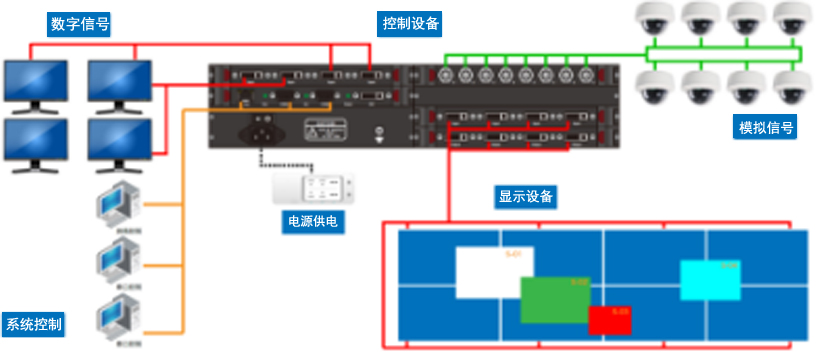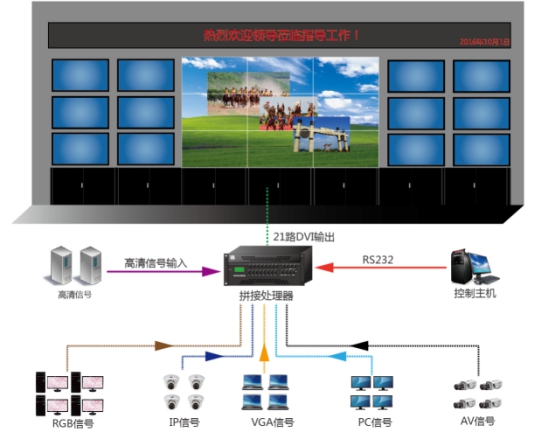 CYL-C6000用于圖像信號的接入、處理、顯示及控制功能,信號源用于給系統提供可顯示的信號,包括電腦、視頻、網絡等,信號源的數據通過分配、傳輸、切換等中間環節,最終接入拼接控制器。控制器是大屏幕顯示系統的控制核心,負責將輸入的圖像按照用戶要求送到輸出的大屏上。輸出端可直接與模擬輸出連接器、計算機監視器或者其他高速度顯示設備相連。