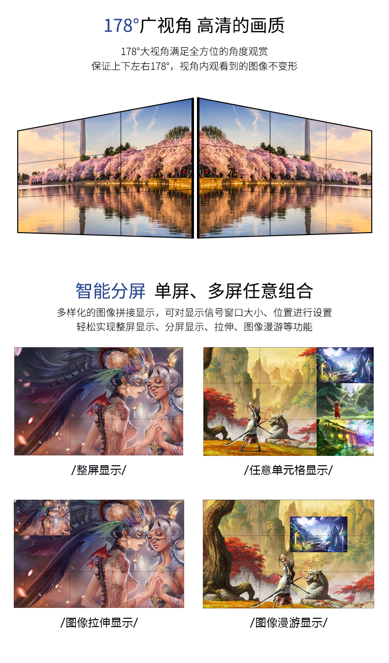 178°大廣視角可實(shí)現(xiàn)單屏、多屏可實(shí)現(xiàn)畫中畫、畫面疊加、畫面開窗、畫面漫游等