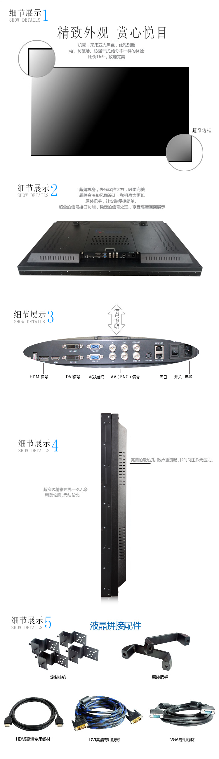 65寸液晶拼接單元采用原裝三星DID液晶拼接屏,雙邊拼縫3.5mm,采用4K高分辨率(3840×2160)、高亮度(700cd/m2)、高對比度(4000:1)、寬視角(178度)的高清LED顯示面板,支持1080P全高清數字視頻顯示。