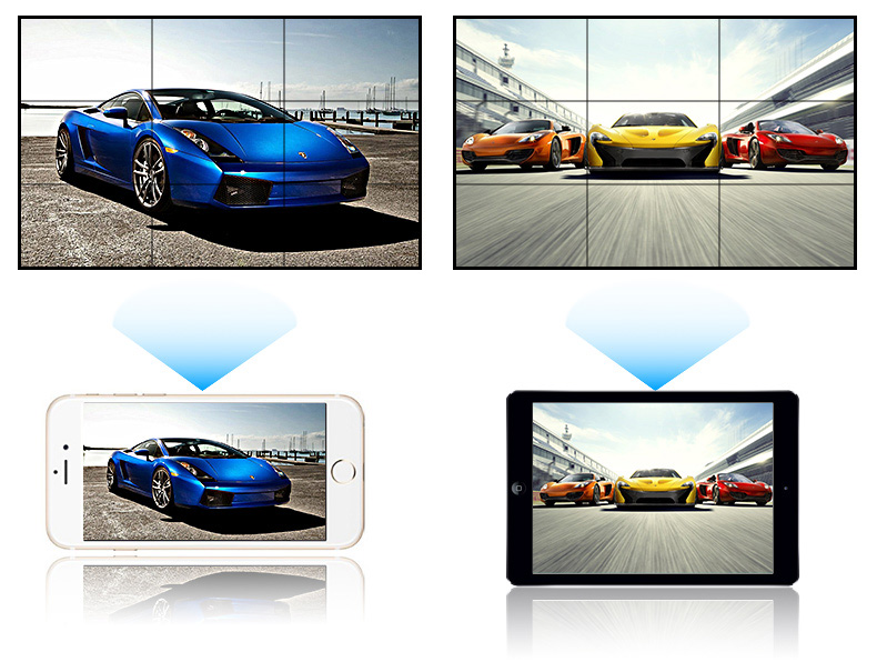 畫面可通過手機,ipad等,移動設備投放到屏幕上同步顯示